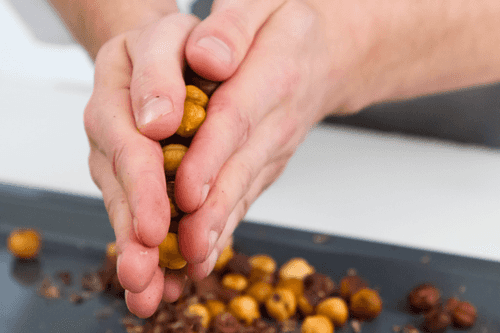 Обжарить фундук на сухом противне в течение 15 минут при 150 градусах. Охладить и облупить шкурку на орехах.