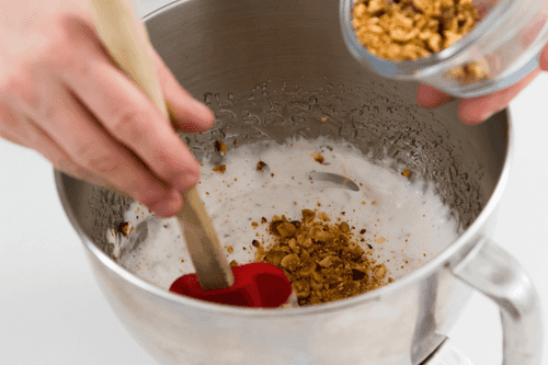 Параллельно сделать сироп: растопить сахар с водой при 110 градусах до кипения. Влить сироп тонкой струйкой в белок, продолжая взбивать. Довести белки до состояния твердых пиков. Аккуратно перемешать с орехами при помощи лопатки.