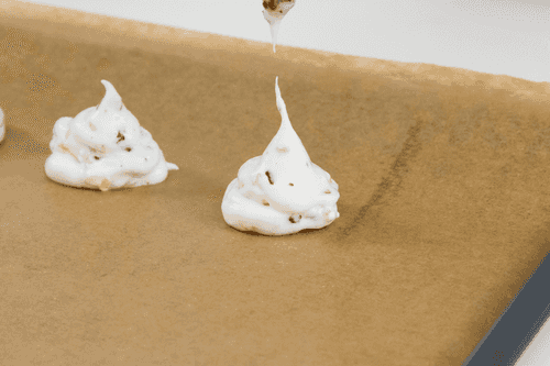 Загрузить белок с сиропом в кондитерский мешок и выдавить пирамидками на застеленный пекарской бумагой противень. Запекать в духовке при температуре 80 градусов в течение 3 часов. Достать из духовки и дать остыть 20–30 минут.