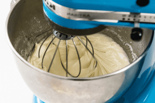 Для бисквитного теста взбить 3 яйца со 150 граммами сахара. Отдельно смешать 110 г муки с разрыхлителем и щепоткой соли. Добавить к яйцам и смешать до однородности.