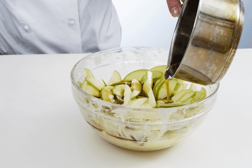 Яблоки избавить от сердцевины и нарезать тонкими дольками. Добавить сок половины лимона и ром, перемешать.