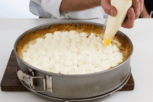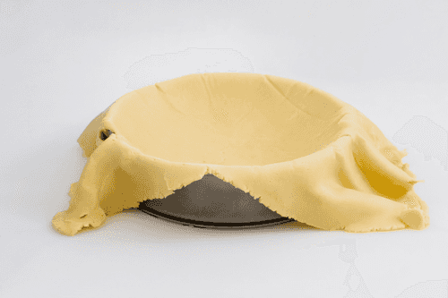 На дно формы выстелить пергамент и затянуть фольгой. Выложить дно и стенки тонким слоем песочного теста.