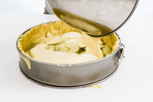 Сверху выложить яблочную массу, дальше распределить остатки бисквитного теста. Поставить в разогретую до 180 градусов духовку на 15 минут. Затем снизить температуру до 160 и оставить еще на 25 минут.