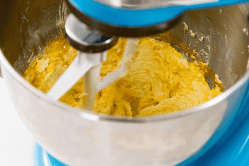 В чаше миксера на средней скорости смешать 170 г размягченного сливочного масла с 50 граммами сахара. Добавить желтки и продолжать мешать до однородности.