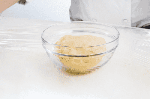 Немного обмять тесто на рабочей поверхности, присыпанной мукой, переложить его в большую миску, накрыть пленкой и поставить в теплое место на 4 часа.