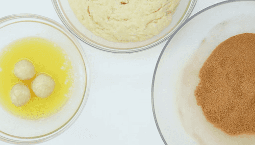 Растопить оставшееся масло и перелить его в большую чашу. В другой чаше смешать коричневый сахар с корицей