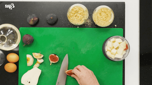 Грушу и инжир очистить от кожи и произвольно нарезать. Пробить их вместе в блендере. Получившееся пюре переложить в половину подготовленных бокалов.