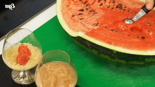 В другие бокалы положить кусочки арбуза. Можно вырезать из арбуза шарики при помощи нуазетки.