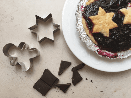 Смазать формочки для выпекания сливочным маслом, выложить в них тонким слоем тесто в форме «корзиночек». Наполнить тарталетки вареньем из черной смородины (можно также использовать ягоды, прокрученные в блендере), сверху натереть на терке немного оставшегося теста или вырезать из него фигурные формы для украшения пирожного.