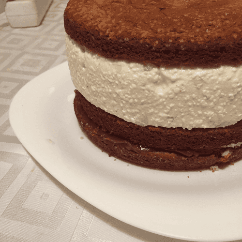 Делим основу на три части, нижнюю смазываем слоем сгущенки, накрываем следующей частью основы, кладём застывшую творожную массу, накрываем верхним слоем.