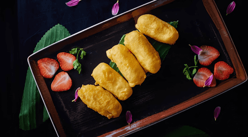 Нарезать застывшую массу на прямоугольные кусочки среднего размера. Поставть на средний огонь разогреваться масло для фритюра. Обвалять кусочки в смеси муки с кукурузным и картофельным крахмалом с добавлением небольшого количества соды и разрыхлителя. Жарить порциями в горячем фритюре до золотистого цвета. Обсушить на бумажных полотенцах и сразу подавать, украсив мятой и клубникой.
