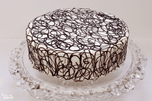 Декорировать торт. У меня - просто круги-каракули по всей поверхности торта. Декор надо делать быстро, т.к. глазурь застывает. Если глазурь застыла, разогреть ее в сотейнике. Когда глазурь застынет, аккуратно снять фольгу.