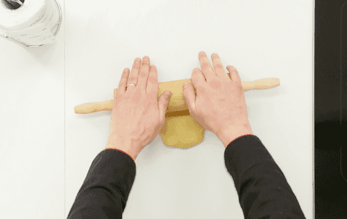 На рабочую поверхность насыпать муку горкой, сделать в ней лунку, и, постепенно вливая туда яйца, замесить тесто. Завернуть тесто в пищевую пленку и оставить на 20 минут.