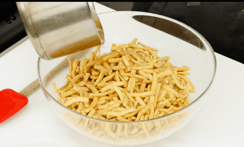 Залить лапшу горячим медовым сиропом и аккуратно перемешать.