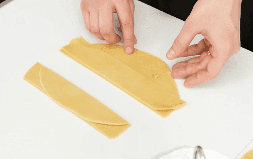 Каждый лист теста нарезать полосками шириной 5 см, а эти полоски нарезать тонкой соломкой.