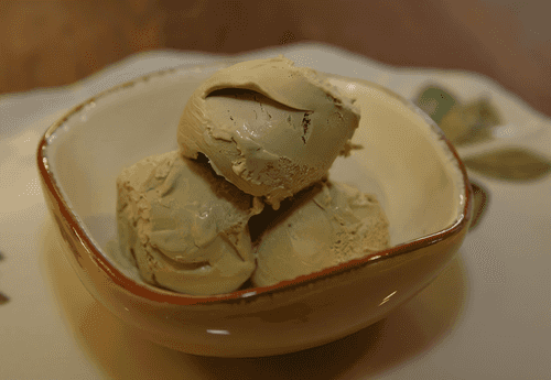 Порошок зеленого чая развести небольшим количеством горячих сливок с желтками и перемешать, затем добавить получившуюся пасту в оставшуюся сливочно-желтковую массу и протереть через сито, чтобы избавиться от комочков.