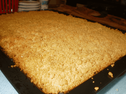 Половину крошки выложить в смазанную маслом форму (у меня прямоугольная 30 см*22 см), уплотнить.