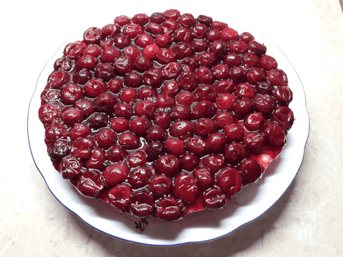 Когда творожный слой застынет, выкладываем вишню и заливаем её вишневым желе (желе готовится по пункту 3, но вместо воды используем вишнёвый сок, добавляем в него сахар и сок лимона). Ставим в холодильник на 1 час. Примечание. Если Вы не любите вкус свежей вишни, то можно мороженую вишню опустить на минуту в кипящий сахарный сироп.
