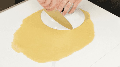 Раскатать тесто и вырезать круги диаметром примерно 20 см. Можно воспользоваться тарелкой.