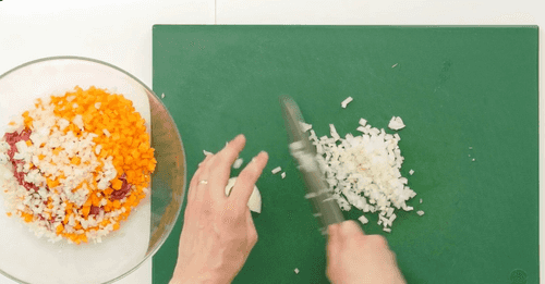 Все овощи нарезать мелкими кубиками. Перемешать.