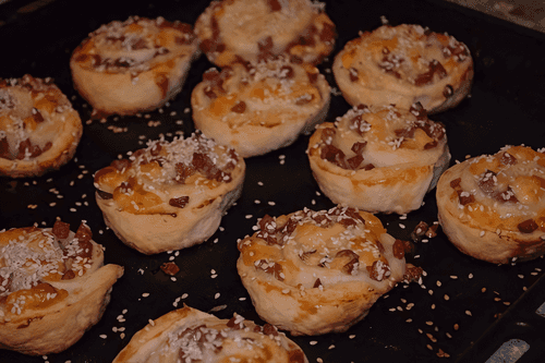 Разрезать рулет на порции, переложить слойки с сыром и колбасой на противень и посыпать их семечками кунжута.