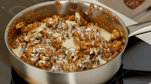 Растопить коричневый сахар, добавить орехи, перемешать, добавить сливки, довести до кипения и держать на огне 5-10 минут, пока масса не приобретет карамельный цвет.
