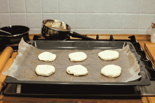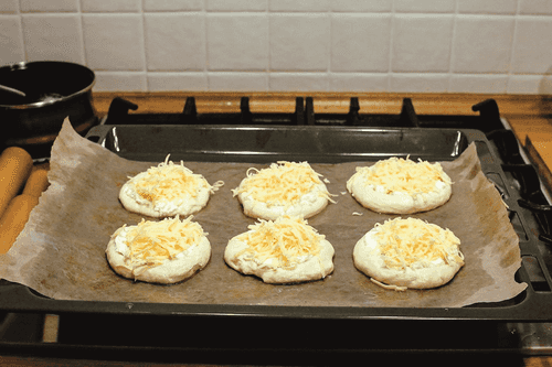 Переложите лепешки на противень, застеленный бумагой для выпечки.
