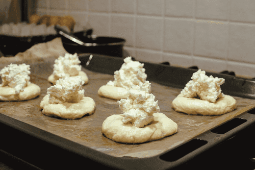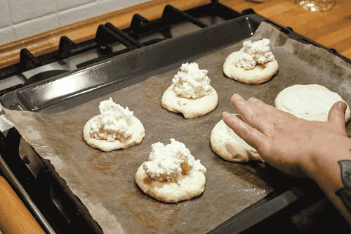 За время расстойки нагрейте духовку до 220 градусов. Поставьте противень с шаньгами в духовку. Выпекайте 12–15 минут.