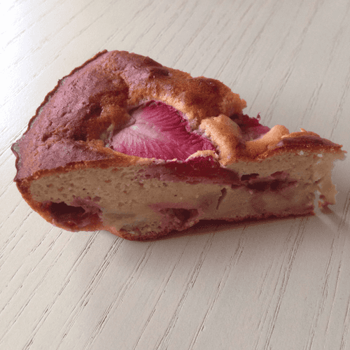 Выложить тесто в силиконовую форму, сверху выложить дольки оставшейся клубники и запекать в разогретой до 175° духовке 40 минут (не передержите, проверяйте по румяности и методом «сухой зубочистки»).