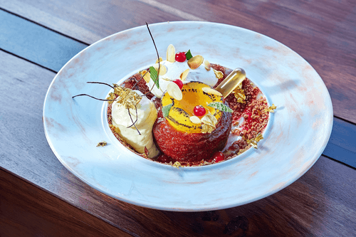 Ром-баба «Мельба» – изысканный десерт испанской кухни, вдохновленный утонченным стилем французской гастрономии. Его история уходит корнями в традиционные ромовые пирожные, которые со временем обрели новые оттенки вкуса и оригинальные способы подачи. В этом варианте воздушное дрожжевое тесто пропитывается насыщенным сиропом с ромом, создавая влажную, ароматную текстуру. Тонкие сладкие ноты ванили и карамелизированного сахара идеально сочетаются с легкой кислинкой красной смородины и персика, добавляя свежесть. Украшение из крамбла с корицей, воздушного ванильного мусса и миндальных слоек завершает кулинарную симфонию. Этот десерт – не просто сладкое угощение, а настоящее произведение искусства, идеально подходящее для особых моментов или неспешного наслаждения чашечкой кофе в уютной атмосфере.