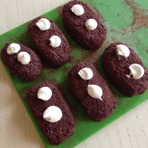 Из полученной массы сформировать пирожные (у меня вышло 10 шт), сверху припорошить какао-порошком, и с помощью кондитерского мешка осадить по 2 капли творожного крема.