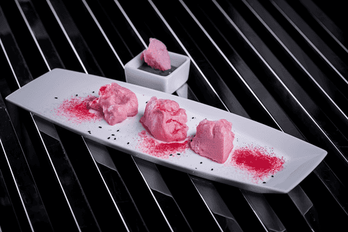Подавать меренги, присыпав слегка натуральной малиновой пудрой, с кремом, посыпанным поджаренным черным кунжутом.