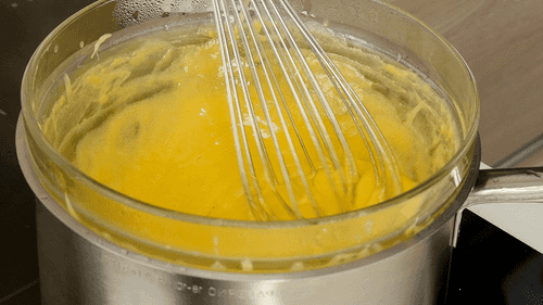 Медленно и осторожно влить половину горячего кокосового молока к желткам, постоянно помешивая.