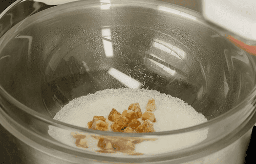 Поставить кастрюлю на водяную баню. Смешать в кастрюле сахар.