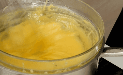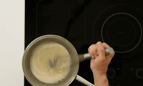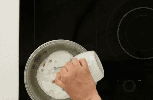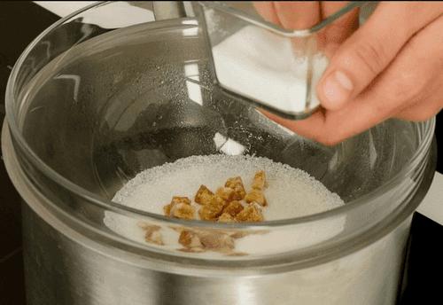 Когда молоко закипит, а сахар растопится, убрать баню с огня.