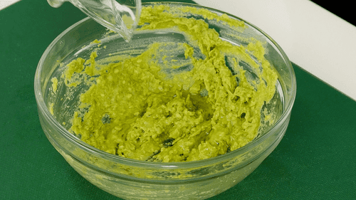 Авокадо размять при помощи вилки или пробить блендером, добавив немного уксуса, чтобы мякоть не потемнела.