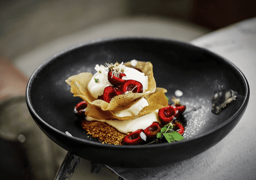 Этот изысканный медовик с черешней, подаваемый с нежным сметанным мороженым, представляет собой уникальное сочетание вкусов, которое прекрасно отражает кулинарную философию ресторана White Rabbit. Мягкие слои медового коржа, пропитанные сладковатым черешневым соком, гармонично уравновешиваются освежающим и легким мороженым на основе сметаны. Это блюдо не только радует глаз, но и создает незабываемое гастрономическое впечатление, идеально подходящее для особых случаев или романтических ужинов.
