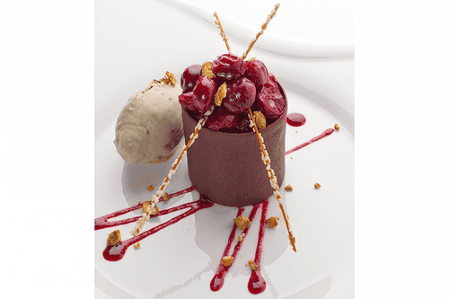 Этот роскошный десерт — изысканное сочетание японской кулинарной точности и европейской кондитерской традиции. Ролл из шоколадного сигаретного теста с шоколадным и фисташковым кремом — это гармония текстур и вкусов. Хрустящее тонкое тесто, приготовленное по специальной технике, оборачивает нежнейший крем, где насыщенный шоколад встречается с тонким ореховым оттенком фисташек. Вишневый акцент, дополненный ликером «Амаретто», придаёт десерту благородную фруктовую кислинку. Каждая деталь этого блюда — дань тонкому искусству создания десертов, в котором баланс сладости, кислинки и кремовой нежности делает его незабываемым. Подаётся с шариком мороженого, добавляя свежесть и контраст текстур. Идеальный выбор для утонченного наслаждения и завершения изысканного ужина.