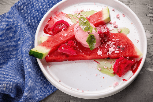 Арбуз с марципаном – изысканный десерт, который сочетает свежесть сочного арбуза с нежной сладостью марципана. Этот рецепт берет вдохновение из французской кухни, где искусство десертов доведено до совершенства. Миндальная паста, приготовленная с сахарным сиропом, превращается в мягкий, бархатистый марципан, который служит основой для кубиков спелого арбуза. Малиновое пюре добавляет легкую кислинку, а базиликовый сироп – освежающую травяную нотку. Завершают композицию меренги-безе, придавая воздушную текстуру, и сорбет из малины, который делает десерт по-настоящему роскошным. Такой десерт идеально подходит для летнего ужина на открытом воздухе, он радует вкусом, красотой и гармонией ингредиентов.