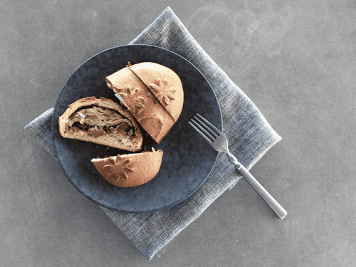 Закрепить тесто, перевернуть и придать форму полу овала. Украсить узорами из теста (30 гр.).