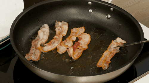 Весь бекон, кроме трех кусочков, пожарить на сковороде до золотистой корочки. Обжаренный бекон переложить на бумажные полотенца, а жир из сковородки слить, он еще пригодится.