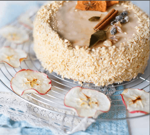 Украсьте торт изюмом, яблочными чипсами, корицей и орехами (100 гр.).