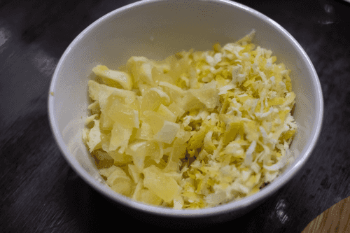 Натереть на терке цедру двух лимонов, можно прямо с белой шкуркой. Легкая горчинка варенью совсем не помешает. Оставшуюся мякоть нарезать на мелкие дольки. Можно выжать сок и использовать его вместо долек лимона. Цедру добавить к инжиру в кастрюлю, лимон или сок отложить.
