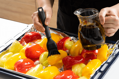 Смазать кожицу каждого кусочка перца оливковым маслом. Выложить на застеленный фольгой противень кожицей вверх. Рядом выложить зубчики чеснока, не снимая с них шелуху.