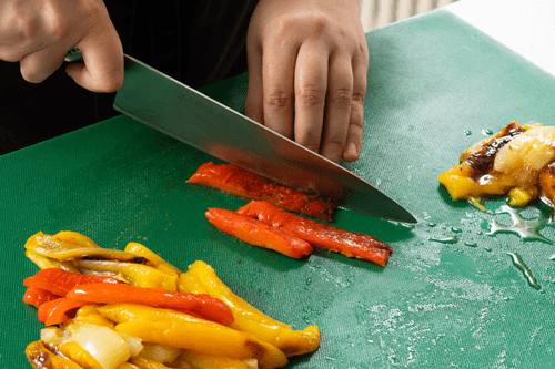 У перцев по кругу вырезать плодоножки и вынуть сердцевину с семенами. Нарезать перцы на четвертинки, тщательно удалить перегородки.