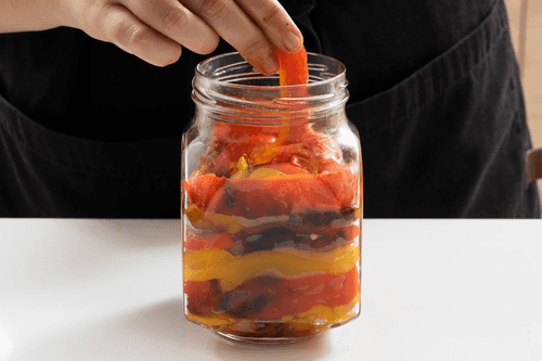 Выложить слоями перец в стерилизованные банки.