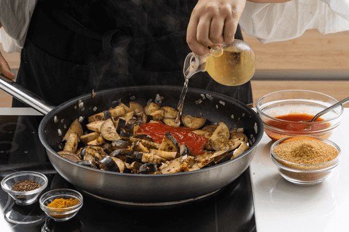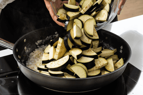Нарезать баклажаны полукольцами, выложить к луку и обжаривать 10 минут до мягкости.