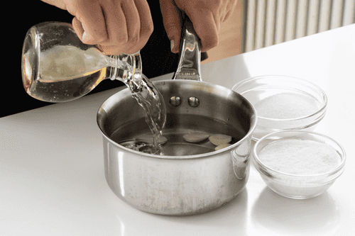 В небольшом сотейнике смешать воду, сахар, уксус, соль. Добавить разрезанные вдоль пополам зубчики чеснока. Довести до кипения и снять с огня.