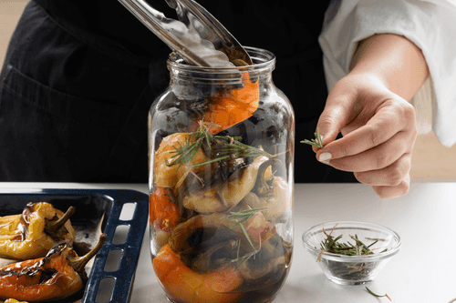 Запеченные перцы разложить в стерилизованные банки вместе с листиками розмарина. Залить горячим маринадом.