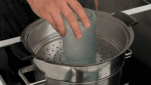 Банку и крышку стерилизовать: установить банку вверх дном над паром на 10–15 минут.